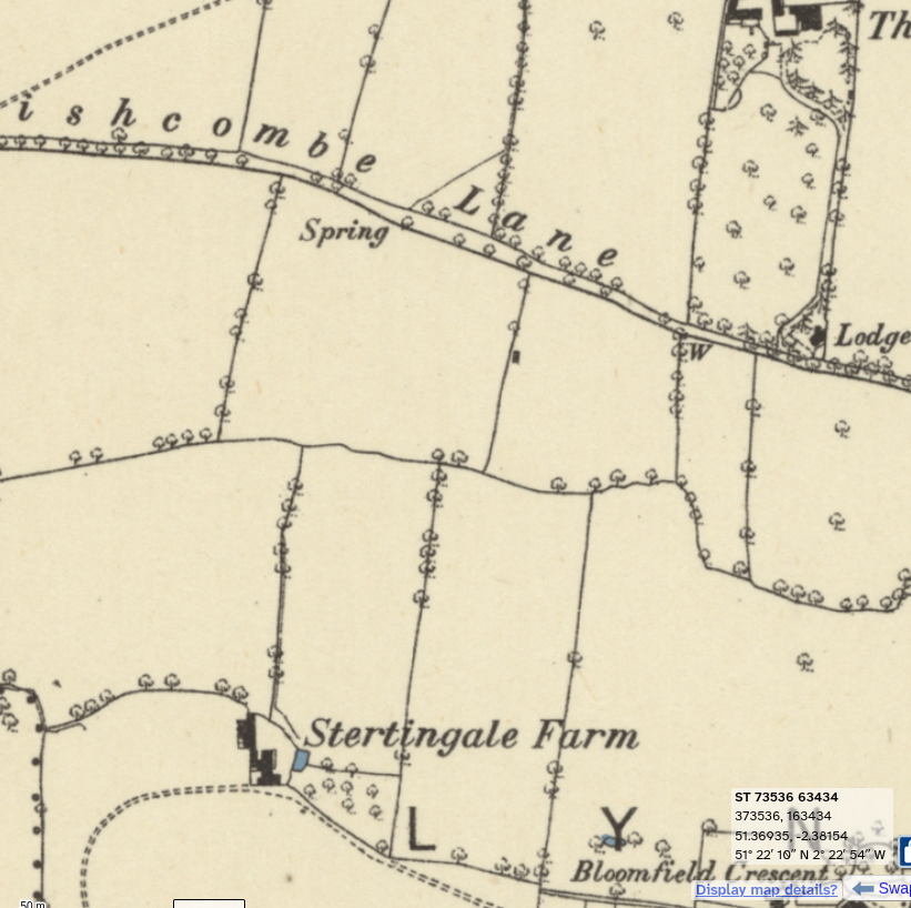 By then, Stirtingale Farm (Stertingale on old maps as mentioned in this 1865 Bath Chronicle article) was an established farm, but the Moors Farm, belong to the Moorlands estate had gone .
